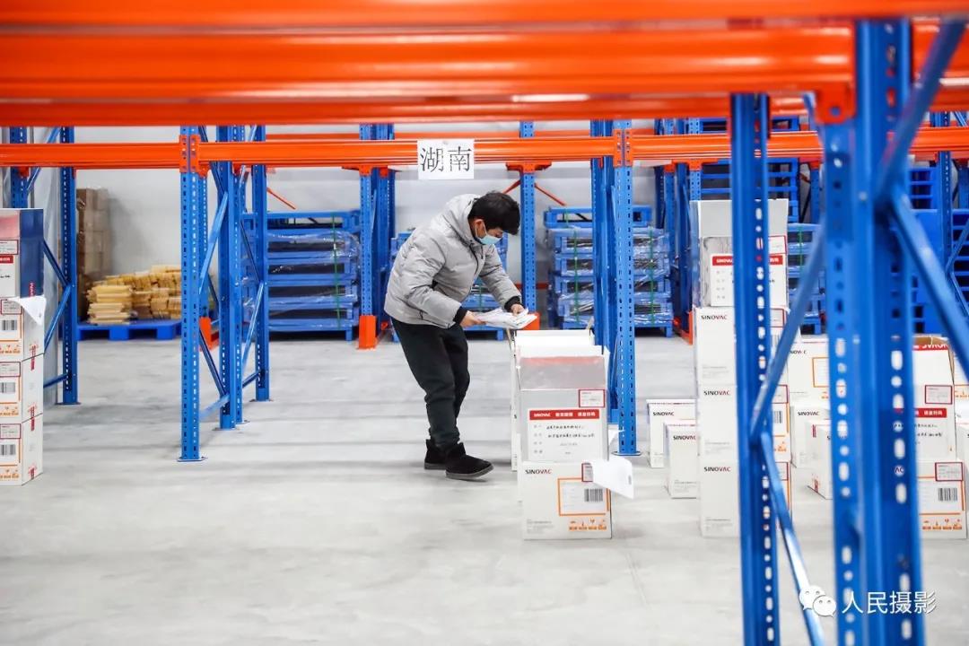2021年1月6日,科兴中维的工作人员在新冠病毒灭活疫苗成品冷库为产品发货做准备。