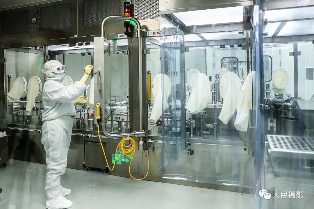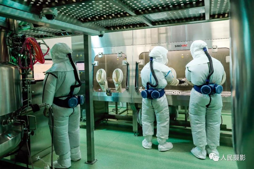 2020年7月15日,科兴中维的工作人员在即将投产的新冠病毒灭活疫苗原液车间高级别生物安全防护区内模拟新冠病毒接种操作。