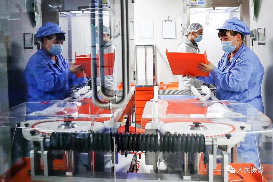 2021年1月6日,工作人员在科兴中维新冠疫苗包装车间的全自动灯检机旁工作。