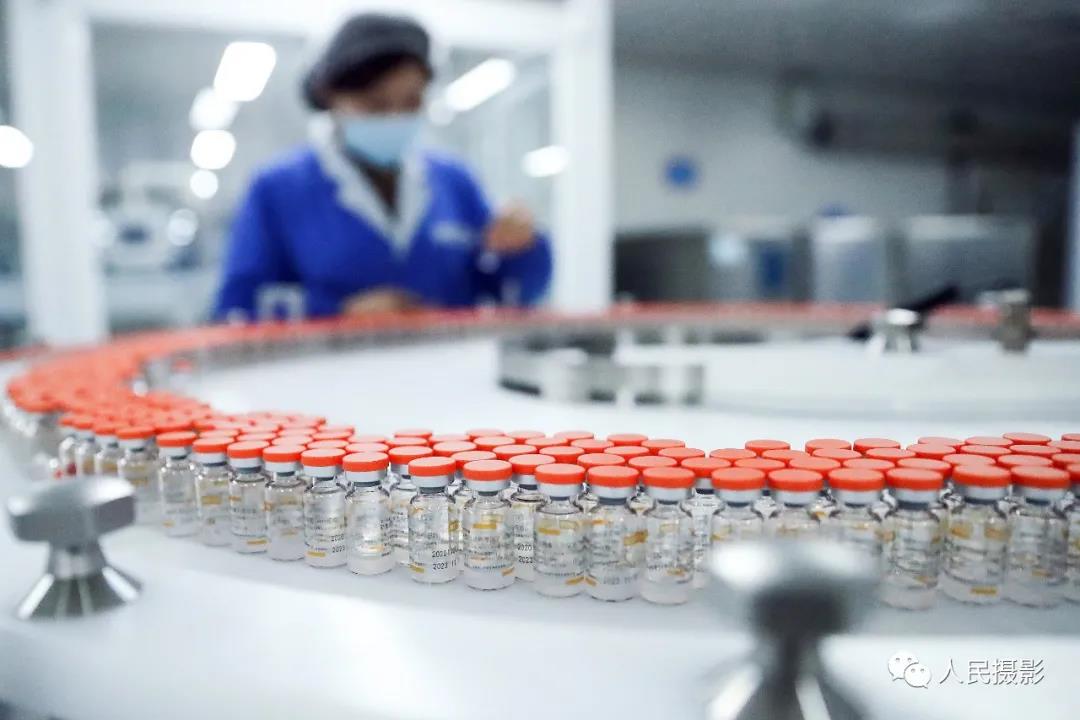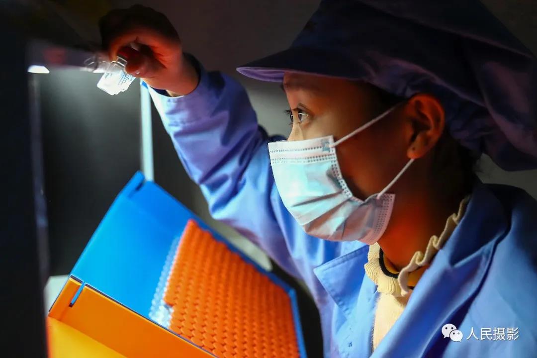 2020年12月23日,科兴中维的工作人员在包装车间对西林瓶包装新冠病毒灭活疫苗进行人工抽检。