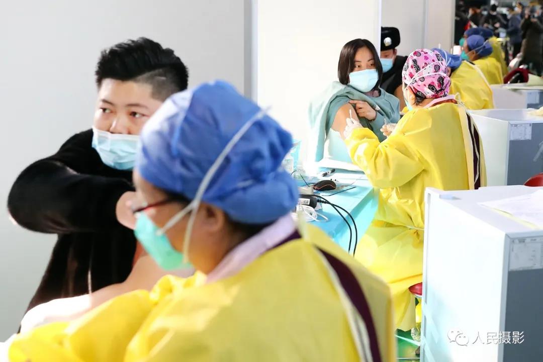2021年1月6日,医护人员在北京市海淀区中关村街道临时接种点为接种人员注射新冠疫苗。