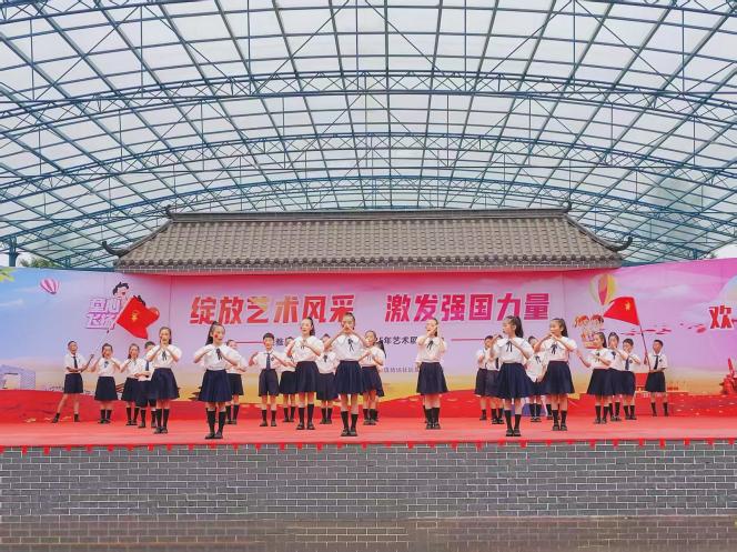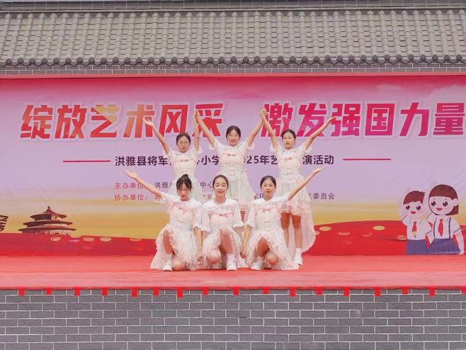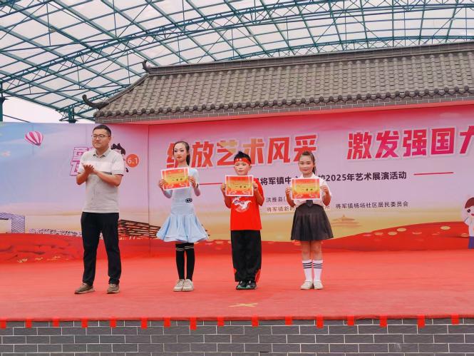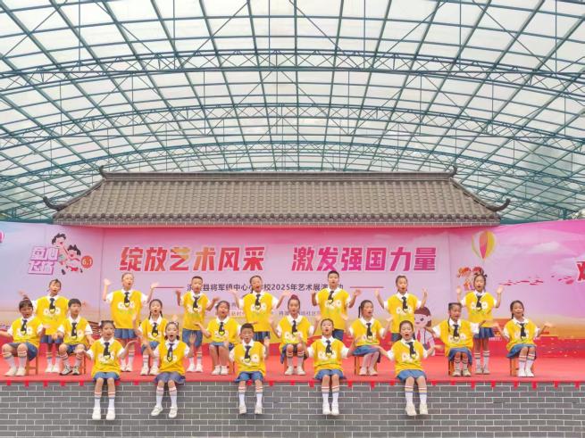 为庆祝第76个“六一”国际儿童节,丰富少年儿童精神文化生活,展现新时代少年儿童积极向上的精神风貌,2025年5月30日上午,将军镇新时代文明实践所联合杨场社区居委会、将军小学隆重举办了“绽放艺术风采 激发强国力量”主题艺术展演暨文明实践活动。学校师生、家长及社区居民欢聚一堂,共同见证孩子们的成长与快乐。 上午9时许,活动在欢快的氛围中拉开帷幕,来自幼儿园和小学各年级的孩子们带来了精心准备的17个精彩节目。舞台上,童声稚嫩却充满力量,舞步灵动洋溢着纯真。从幼儿园小朋友活泼可爱的《童年叮叮当》,到高年级学生演绎的充满活力的《启明星》《我的未来式》;从展现童趣的《虫儿飞》《小美满》,到体现地域特色和艺术美感的《苗家娃娃》《舞蹈拉丁、伦巴》;再到富有教育意义的《安全伴我行》《拖拉和马上》,以及社区带来的节日祝福节目……一个个精彩的表演轮番登场,风雨中更显将军小学学子多才多艺、自信阳光的风采,赢得了现场观众阵阵掌声与喝彩。特别是一曲《国家》,更加传递了孩子们炽热的爱国情怀。