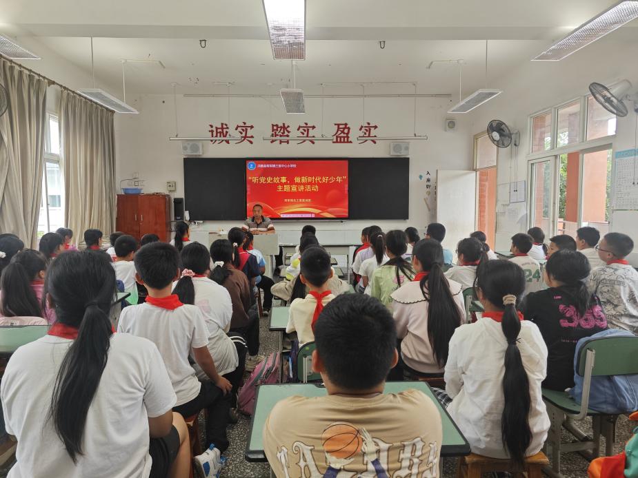 为深入学习贯彻党的二十届三中全会精神,深入学习领会习近平总书记提出的一系列新观点、新论断、新思想,2025年6月5日,在将军镇三宝小学,镇关工委执行主任张家全同志以《听党史故事,做新时代好少年》为主题,为孩子们讲授了一堂精彩的党史课。 从南湖红船启航的星火微光,到长征路上雪山草地的壮烈足迹;从天安门城楼上“中国人民站起来了”的庄严宣告,到改革开放春潮中焕然一新的神州大地。当听到革命先辈在枪林弹雨中前赴后继,同学们屏息凝神;当讲述建设者们用双手在废墟上创造奇迹,孩子们眼中闪烁着自豪的光芒。这一个个故事,是鲜血写就的忠诚,是汗水浇灌的信念。最后,全体同学在张主任的带领下用清澈而铿锵的声音向时代发出宣言:“请党放心,强国有我”!