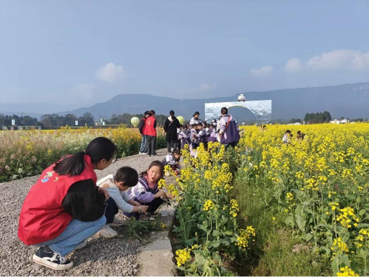 穿着红马甲的志愿者们穿梭在田埂上、观景台上以及道路两旁,热情地为游客们提供引导、问询等服务,同时,也耐心劝导践踏油菜花、采摘油菜花等不文明行为。并向春游的小朋友们科普油菜从播种、生长到收割、制油的过程,在小朋友们的心中种下一颗爱护花草、珍惜粮食的种子。此外,“柳苗”们还化身为专业摄影师,为游客们提供拍照服务,引得游客们频频点赞。