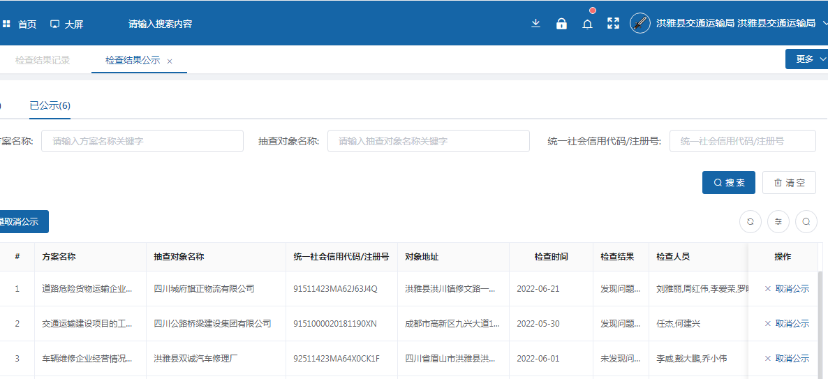 | 洪雅县交通运输局2022年度部门联合“双随机、一公开”抽查计划及抽查结果公示 | ||||||||||||||