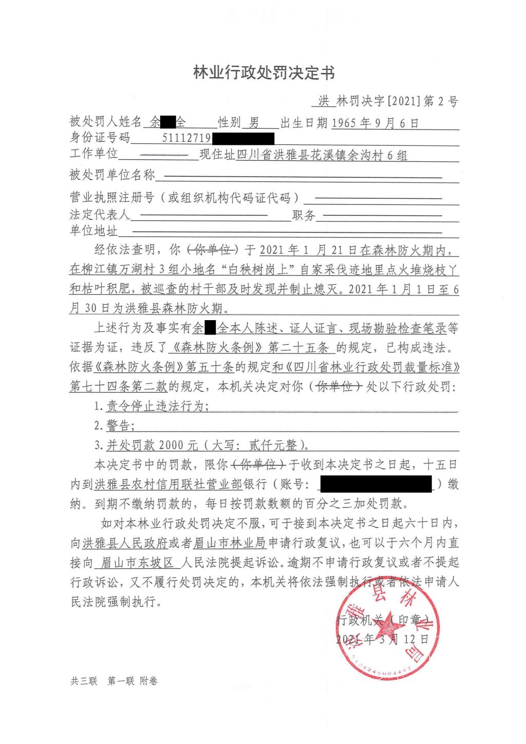 洪雅县林业局林业行政处罚决定书洪林罚决字〔2021〕2号