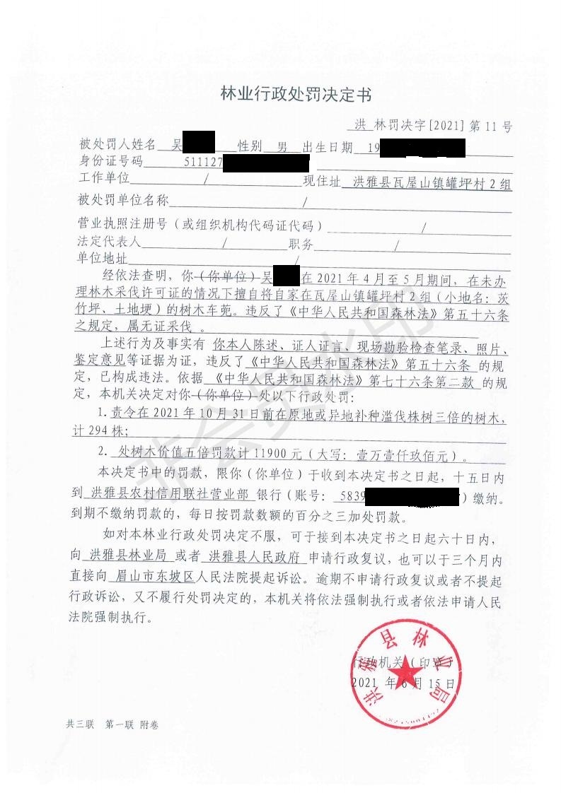 洪雅县林业局林业行政处罚决定书洪林罚决字〔2021〕11号