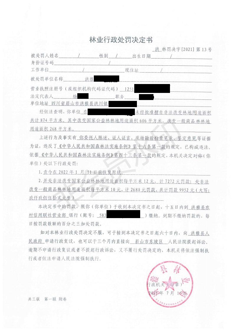 洪雅县林业局林业行政处罚决定书洪林罚决字〔2021〕13号